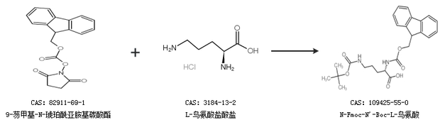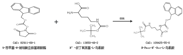1.通過(guò)9-芴甲基-N-琥珀酰亞胺基碳酸酯和N’-叔丁氧羰基-L-鳥(niǎo)氨酸合成N-Fmoc-N''-Boc-L-鳥(niǎo)氨酸,收率約89%;