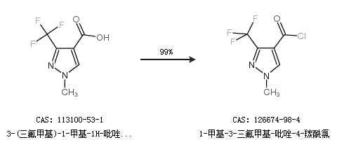 1.通過3-(三氟甲基)-1-甲基-1H-吡唑-4-甲酸合成1-甲基-3-三氟甲基-吡唑-4-羰酰氯,收率約99%;