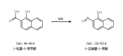 1.通過(guò)1-羥基-2-萘甲酸合成2-亞硝基-1-萘酚,收率約69%;