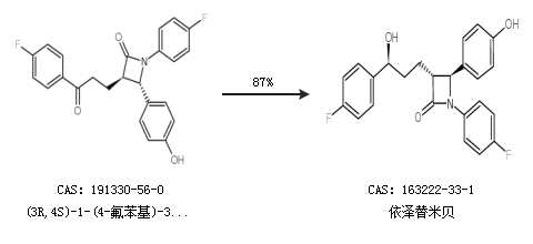 1.通過(guò)(3R,4S)-1-(4-氟苯基)-3-[3-(4-氟苯基)-3-氧代丙基]-4-(4-羥基苯基)氮雜環(huán)丁烷-2-酮合成依澤替米貝,收率約87%;
