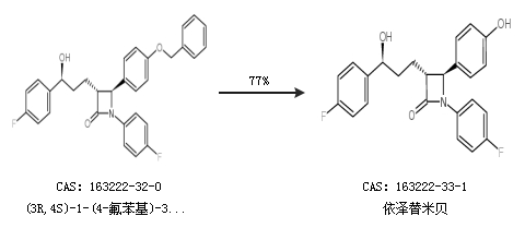 2.通過(guò)(3R,4S)-1-(4-氟苯基)-3-[(3S)-3-(4-氟苯基)-3-羥基丙基]-4-[4-(苯甲氧基)苯基]-2-氮雜環(huán)丁酮合成依澤替米貝,收率約77%;