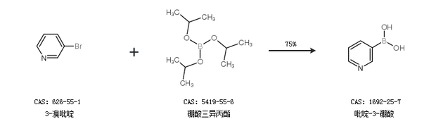 1.通過3-溴吡啶和硼酸三異丙酯合成吡啶-3-硼酸,收率約75%;