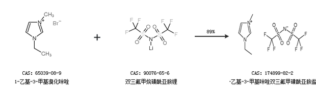1.通過(guò)1-乙基-3-甲基溴化咪唑和雙三氟甲烷磺酰亞胺鋰合成1-乙基-3-甲基咪唑雙三氟甲磺酰亞胺鹽,收率約89%;