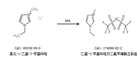 2.通過(guò)氯化-1-乙基-3-甲基咪唑合成1-乙基-3-甲基咪唑雙三氟甲磺酰亞胺鹽,收率約95%;