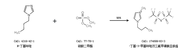 1.通過N-丁基咪唑和硫酸二甲酯合成1-丁基-3-甲基咪唑雙三氟甲磺酰亞胺鹽,收率約98%;