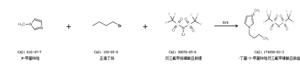 2.通過N-甲基咪唑、正溴丁烷和雙三氟甲烷磺酰亞胺鋰合成1-丁基-3-甲基咪唑雙三氟甲磺酰亞胺鹽,收率約81%;