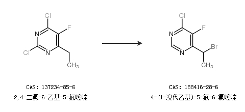 1.通過(guò)4-氯-6-乙基-5-氟嘧啶合成4-(1-溴代乙基)-5-氟-6-氯嘧啶,收率約91%;