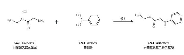 1.通過(guò)甘氨酸乙酯鹽酸鹽和苯硼酸合成N-苯基氨基乙酸乙基醚,收率約83%;