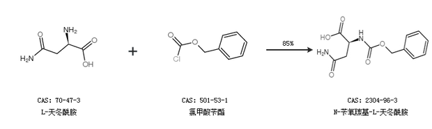 1.通過L-天冬酰胺和氯甲酸芐酯合成N-芐氧羰基-L-天冬酰胺,收率約85%;