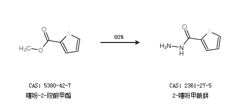 1.通過噻吩-2-羧酸甲酯合成2-噻吩甲酰肼,收率約80%;