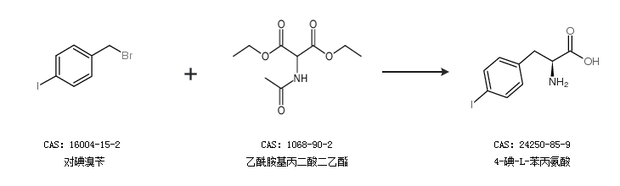 2.通過(guò)對(duì)碘溴芐和乙酰胺基丙二酸二乙酯合成4-碘-L-苯丙氨酸