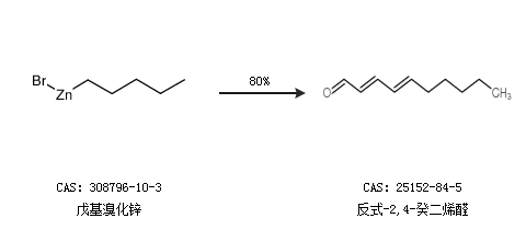2.通過(guò)戊基溴化鋅合成反式-2,4-癸二烯醛,收率約80%;