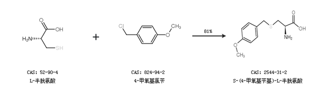 1.通過L-半胱氨酸和4-甲氧基氯芐合成S-(4-甲氧基芐基)-L-半胱氨酸,收率約81%;
