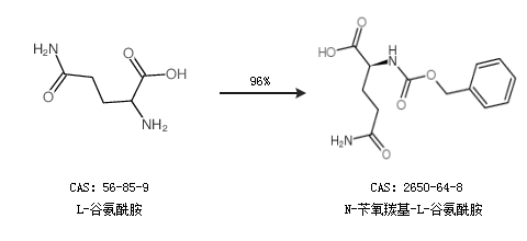 1.通過(guò)L-谷氨酰胺和氯甲酸芐酯合成N-芐氧羰基-L-谷氨酰胺,收率約85%;