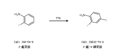 1.通過(guò)2-氟苯胺合成2-氟-4-碘苯胺,收率約77%;