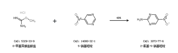 2.通過O-甲基異脲鹽酸鹽和5-硝基嘧啶合成2-氨基-5-硝基嘧啶,收率約49%;