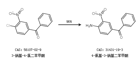 1.通過(guò)3-硝基-4-氯二苯甲酮合成4-氨基-3-硝基二苯甲酮,收率約96%;
