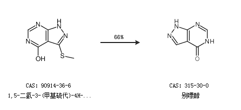 1.通過1,5-二氫-3-(甲基硫代)-4H-吡唑并[3,4-d]嘧啶-4-酮合成別嘌醇,收率約66%;