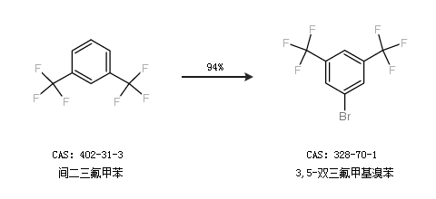 2.通過間二三氟甲苯合成3,5-雙三氟甲基溴苯,收率約94%;