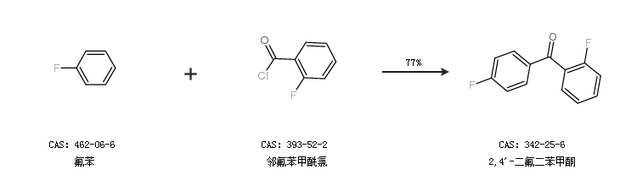 1.通過氟苯和鄰氟苯甲酰氯合成2,4''-二氟二苯甲酮,收率約77%;