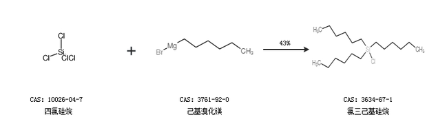 2.通過四氯硅烷和己基溴化鎂合成氯三己基硅烷,收率約43%;