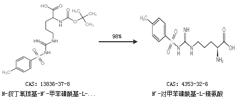 1.通過(guò)N-叔丁氧羰基-N''-甲苯磺酰基-L-精氨酸合成N''-對(duì)甲苯磺?;?L-精氨酸,收率約98%;