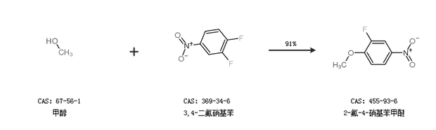1.通過(guò)甲醇和3,4-二氟硝基苯合成2-氟-4-硝基苯甲醚,收率約91%;