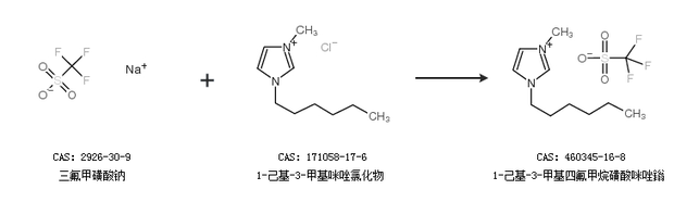 2.通過三氟甲磺酸鈉和1-己基-3-甲基咪唑氯化物合成1-己基-3-甲基四氟甲烷磺酸咪唑鎓