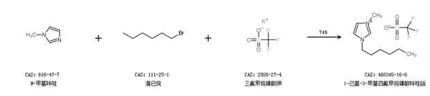 1.通過N-甲基咪唑、溴已烷和三氟甲烷磺酸鉀合成1-己基-3-甲基四氟甲烷磺酸咪唑鎓,收率約74%;