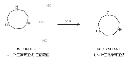 1.通過(guò)1,4,7-三氮環(huán)壬烷 三鹽酸鹽合成1,4,7-三氮雜環(huán)壬烷,收率約91%;