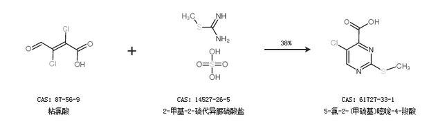 1.通過粘氯酸和2-甲基-2-硫代異脲硫酸鹽合成5-氯-2-(甲硫基)嘧啶-4-羧酸,收率約38%;
