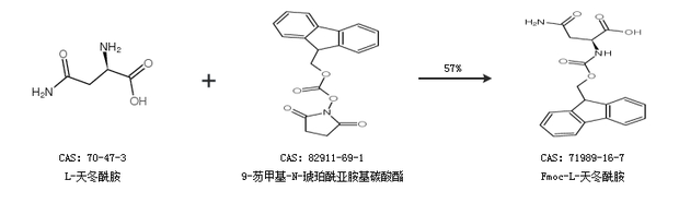 1.通過L-天冬酰胺和9-芴甲基-N-琥珀酰亞胺基碳酸酯合成Fmoc-L-天冬酰胺,收率約57%;