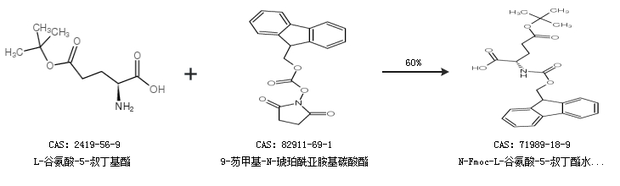 1.通過(guò)L-谷氨酸-5-叔丁基酯和9-芴甲基-N-琥珀酰亞胺基碳酸酯合成N-Fmoc-L-谷氨酸-5-叔丁酯水合物,收率約60%;