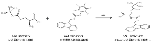 2.通過(guò)L-谷氨酸-5-叔丁基酯和9-芴甲基五氟苯基碳酸酯合成N-Fmoc-L-谷氨酸-5-叔丁酯水合物,收率約93%;