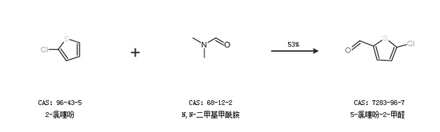 1.通過2-氯噻吩和N,N-二甲基甲酰胺合成5-氯噻吩-2-甲醛,收率約53%;
