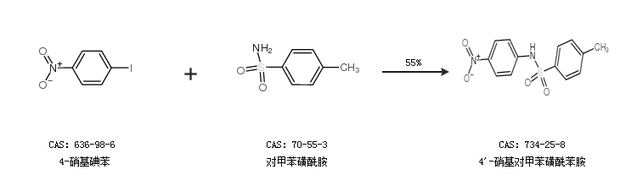 2.通過(guò)4-硝基碘苯和對(duì)甲苯磺酰胺合成4''-硝基對(duì)甲苯磺酰苯胺,收率約55%;