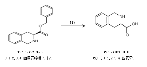 2.通過S-1,2,3,4-四氫異喹啉-3-羧酸芐酯鹽酸鹽合成(S)-(-)-1,2,3,4-四氫異喹啉-3-羧酸,收率約81%;