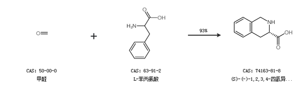 1.通過甲醛和L-苯丙氨酸合成(S)-(-)-1,2,3,4-四氫異喹啉-3-羧酸,收率約93%;
