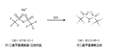 2.通過(guò)雙(三氟甲基磺酰基)亞胺鈉鹽合成雙三氟甲基磺酰亞胺,收率約92%;