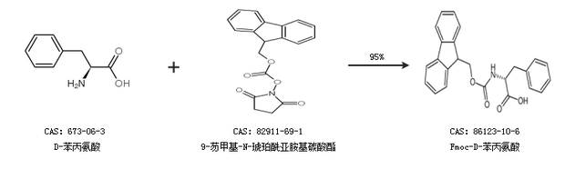 2.通過D-苯丙氨酸和9-芴甲基-N-琥珀酰亞胺基碳酸酯合成Fmoc-D-苯丙氨酸,收率約95%;