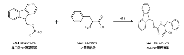 1.通過氯甲酸-9-芴基甲酯和D-苯丙氨酸合成Fmoc-D-苯丙氨酸,收率約67%;