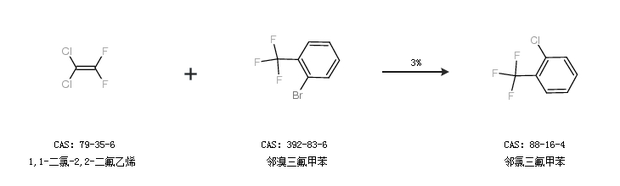 2.通過(guò)1,1-二氯-2,2-二氟乙烯和鄰溴三氟甲苯合成鄰氯三氟甲苯,收率約3%;