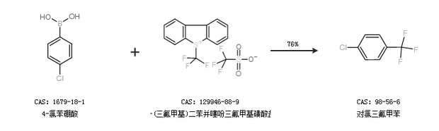 1.通過4-氯苯硼酸和S-(三氟甲基)二苯并噻吩三氟甲基磺酸鹽合成對氯三氟甲苯,收率約76%;