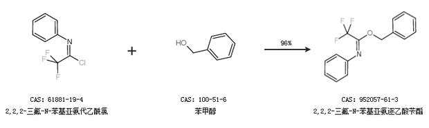 1.通過2,2,2-三氟-N-苯基亞氨代乙酰氯和苯甲醇合成2,2,2-三氟-N-苯基亞氨逐乙酸芐酯,收率約96%;