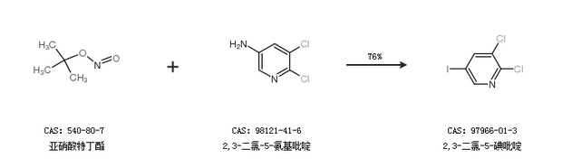2.通過(guò)亞硝酸特丁酯和2,3-二氯-5-氨基吡啶合成2,3-二氯-5-碘吡啶,收率約76%;