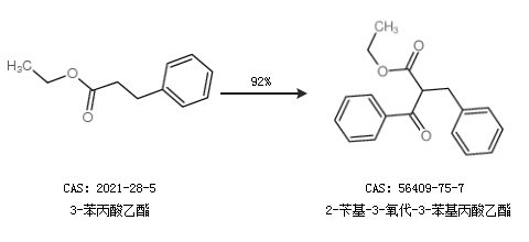 1.通過3-苯丙酸乙酯合成2-芐基-3-氧代-3-苯基丙酸乙酯,收率約92%;