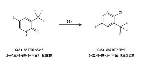 1.通過2-羥基-5-碘-3-三氟甲基吡啶合成2-氯-5-碘-3-(三氟甲基)吡啶,收率約63%;