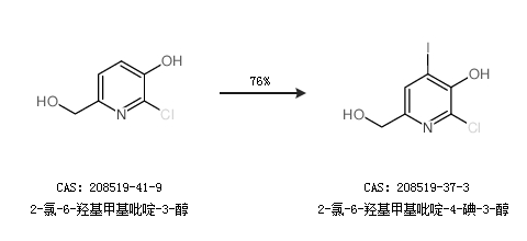 1.通過2-氯-6-羥基甲基吡啶-3-醇合成2-氯-6-羥基甲基吡啶-4-碘-3-醇,收率約76%;