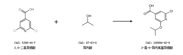 1.通過異丙醇鈉和2,6-二氯異煙酸合成2-氯-6-異丙氧基異煙酸,收率約52%;