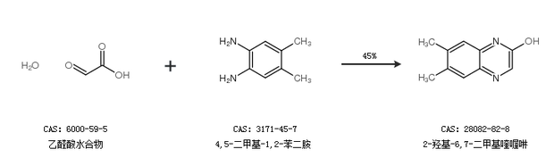 1.通過(guò)乙醛酸水合物和4,5-二甲基-1,2-苯二胺合成2-羥基-6,7-二甲基喹喔啉,收率約45%;
